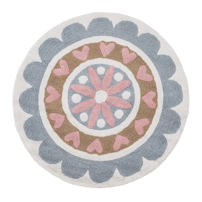 Una alfombra cálida y alegre ideal para la habitación de los reyes de la casa. Fabricada en algodón 100%.