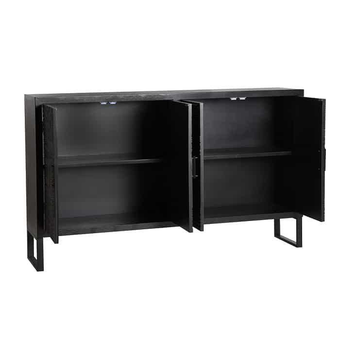 Un aparador original de líneas rectas, fabricado en madera de fresno acabada en negro y combinada en su interior y trasera con dm.