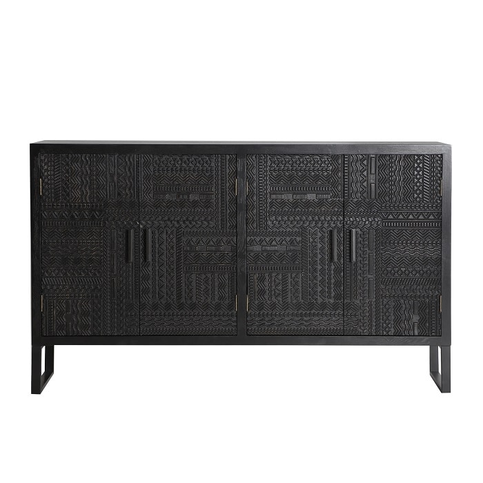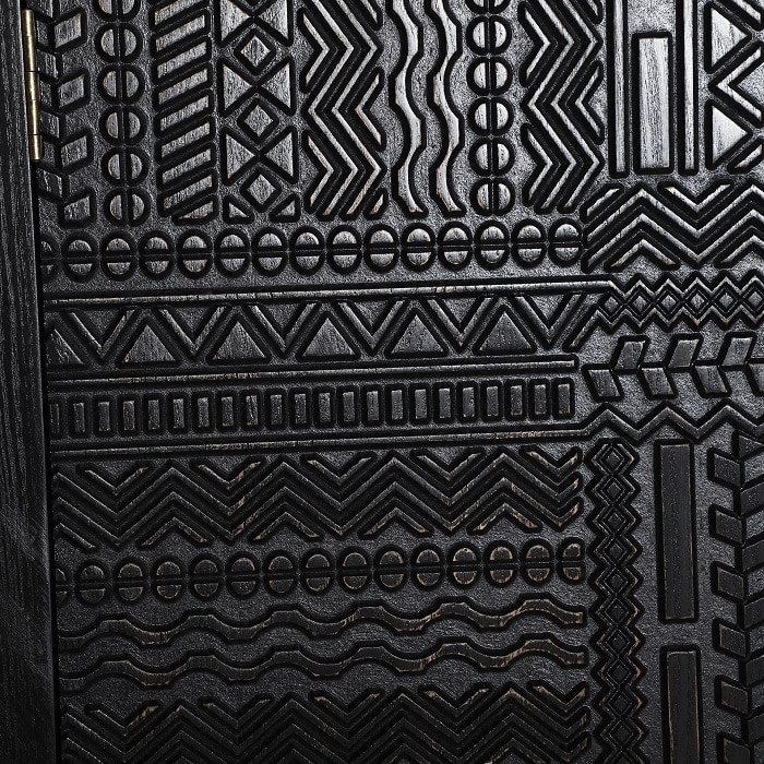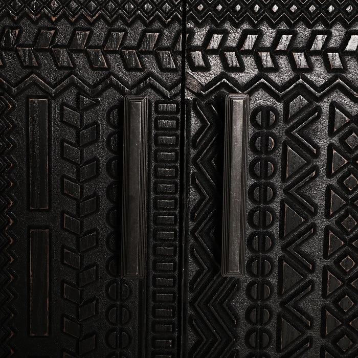 El frontal de las puertas tiene grabados geométricos. Tiradores en metal negro.Kodu