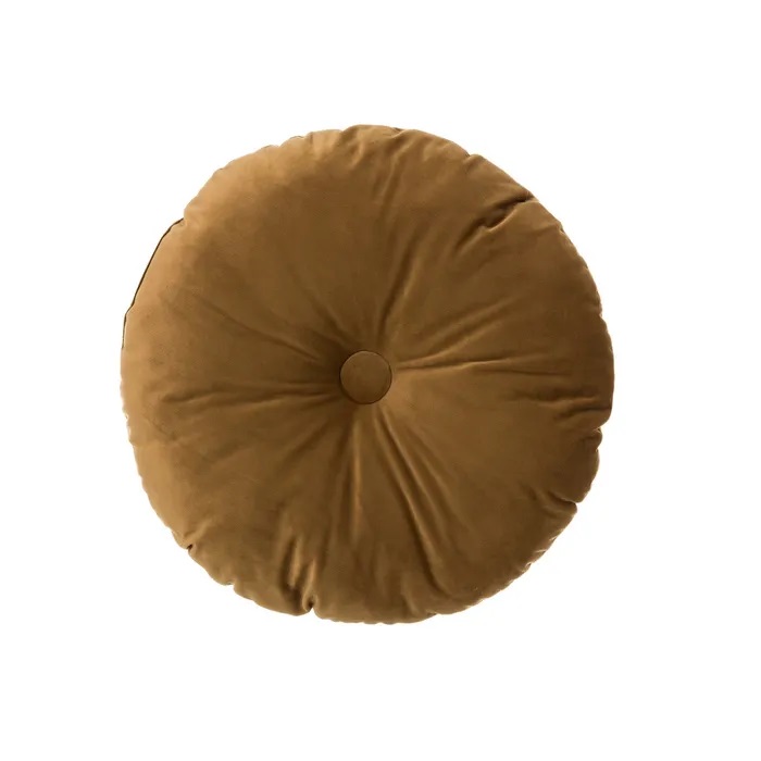 Confortable cojín redondo en terciopelo marrón. Composición poliéster.
