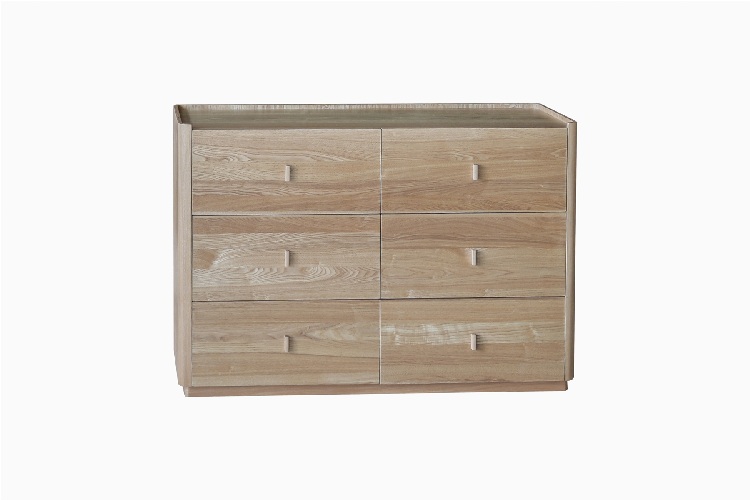 Sus seis amplios cajones ofrecen una solución práctica para el almacenamiento diario, manteniendo el orden sin renunciar al estilo. El acabado en madera clara realza la veta del fresno y aporta luminosidad al espacio, convirtiéndola en una pieza perfecta para dormitorios, vestidores o zonas de almacenaje auxiliares.