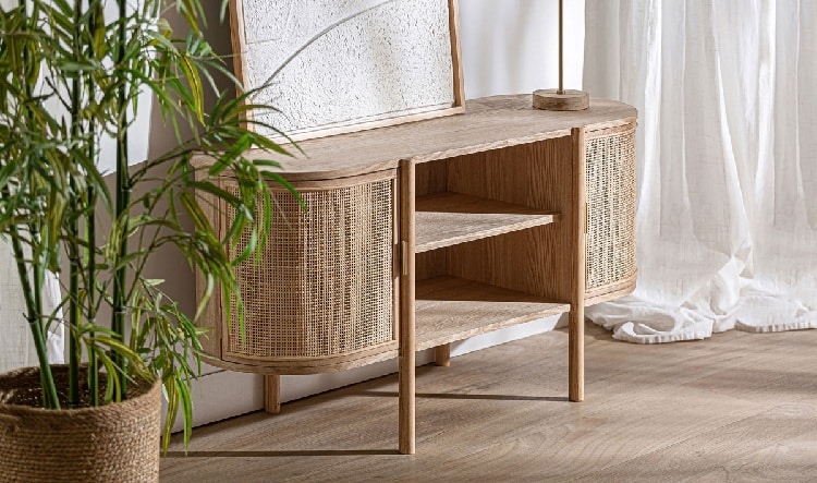 Nuestra cómoda Layki de estructura ovalada destaca por su cuidada combinación de madera de fresno natural y rejilla de ratán en el frontal de los cajones y laterales, aportando ligereza visual y un aire artesanal.