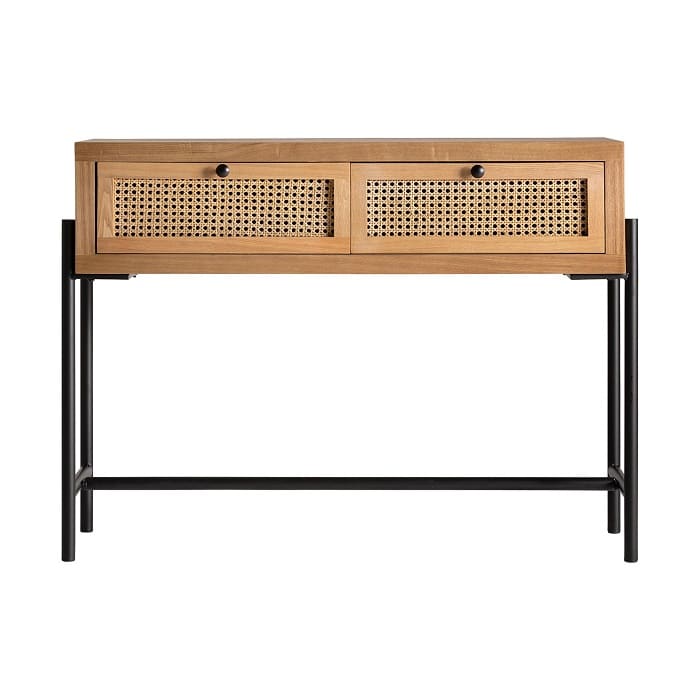 La consola Halden está construida en madera de pino -dm , combinada con rejilla de ratán trenzado en el frontal de los cajones y con las patas en hierro negro para darle el toque industrial. Perfecta para el recibidor y pasillos o auxiliar en salón o comedor. Su tamaño y la comodidad de los cajones, también te permitirá utilizarla como escritorio .Si la combinas con lámpara tipo flexo y un sillón de tipo industrial, obtendrás una zona de trabajo con aires retro.