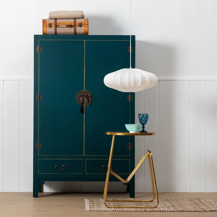 De línea estilizada, está equipada con seis cajones. Fabricada en dm combinada con madera de abeto. Su lacado en un elegante azul oscuro con detalles dorados en los filos aportan un plus de color y sofisticación. Los tiradores son en metal dorado.