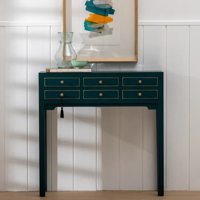 Consola azul de estilo oriental equipada con seis coquetos cajones. Tiradores en metal dorado.