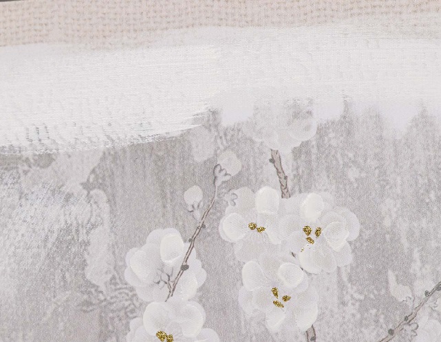 Cuadro sobre lienzo con dibujo de rama de almendro en tonos blancos y grises sobre fono claro. Detalles en dorado. Técnica mixta: 80% a mano-20% impresión.