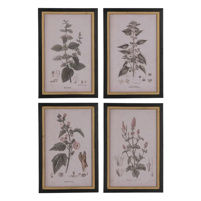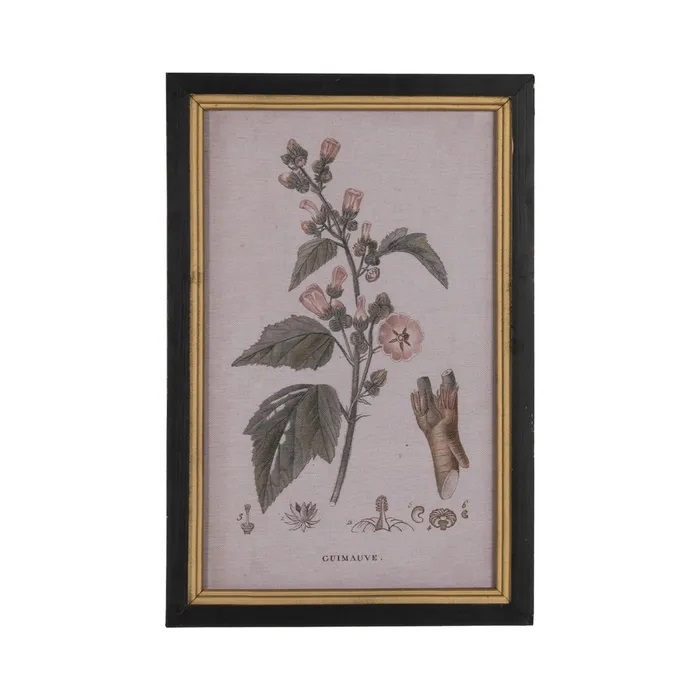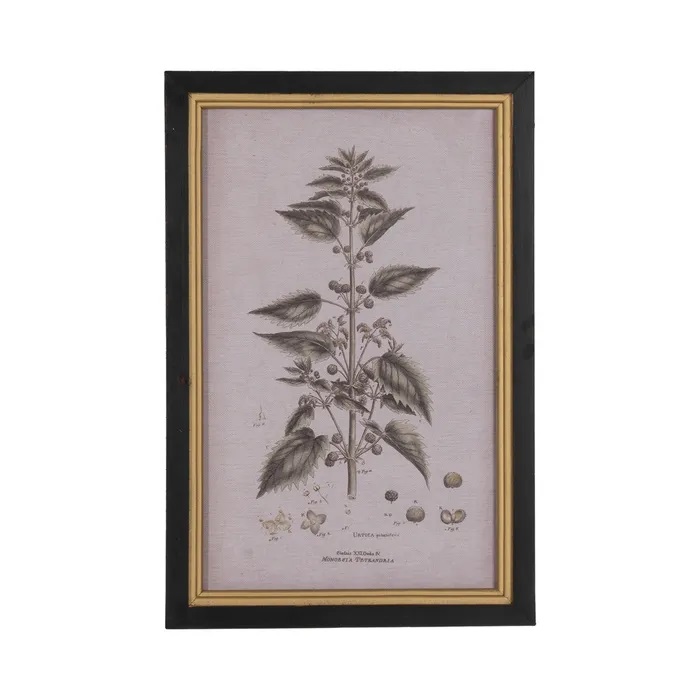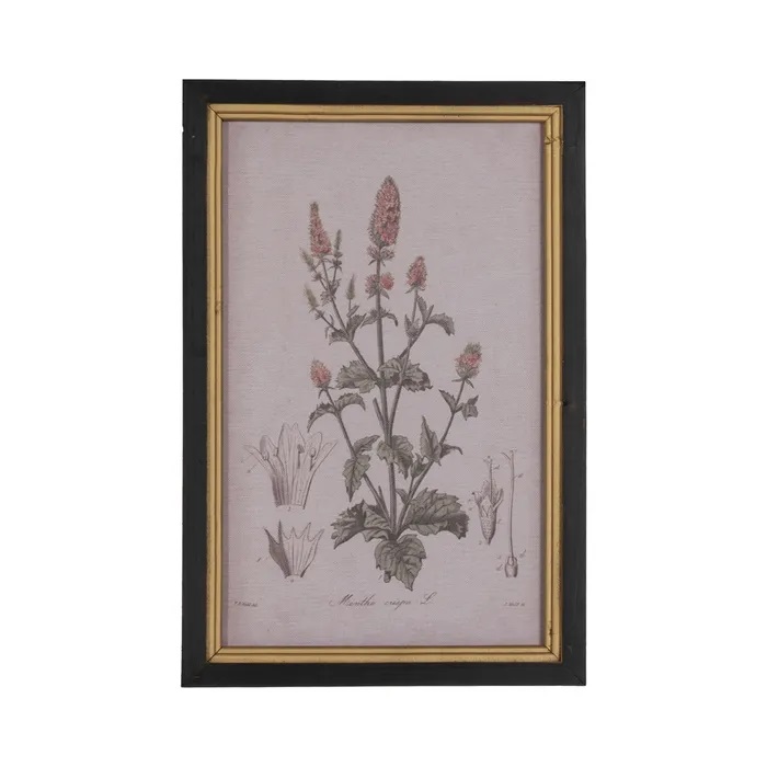 Cuadro de estilo botánico con dibujo impreso de rams y flores sobre fondo claro. Marco en madera color negro.