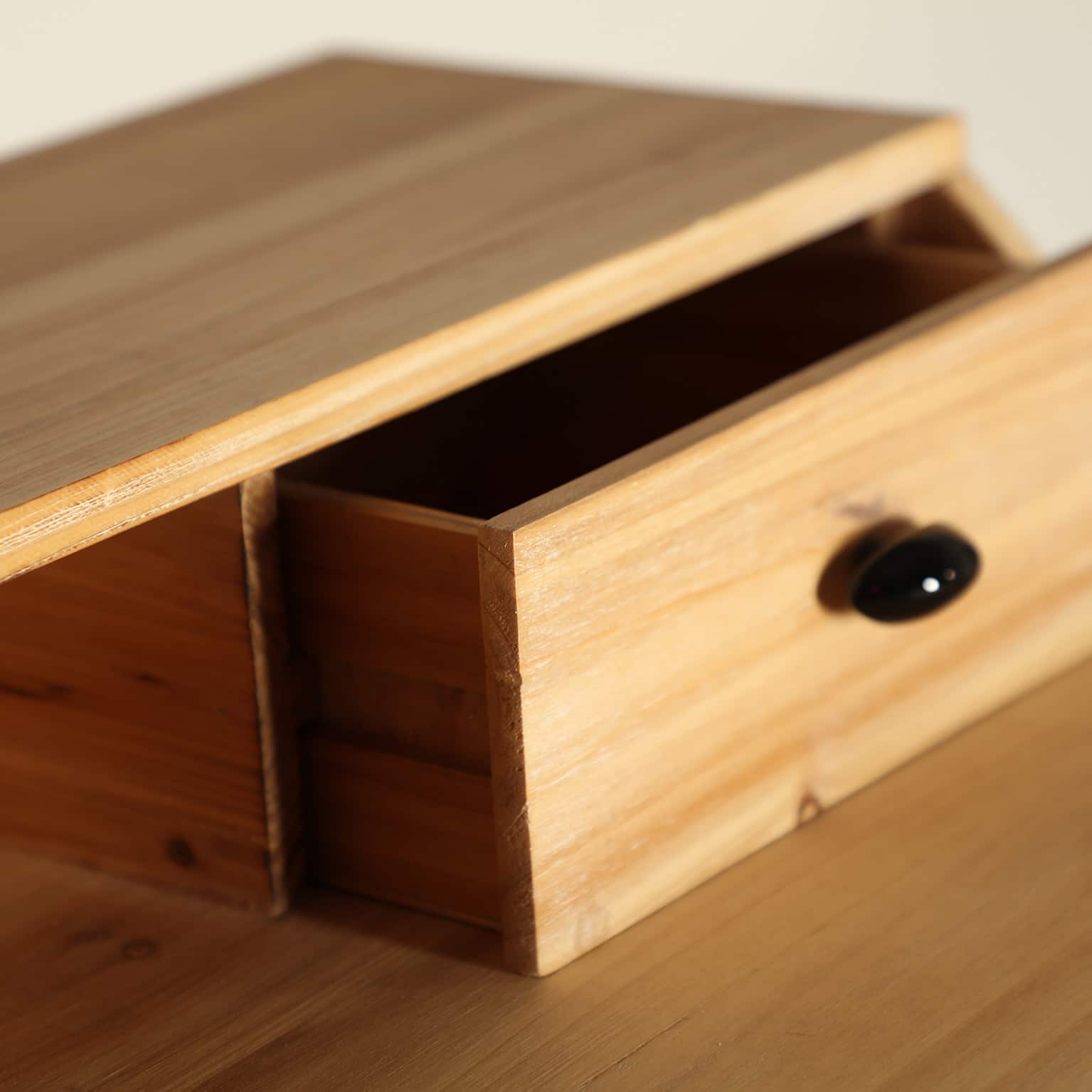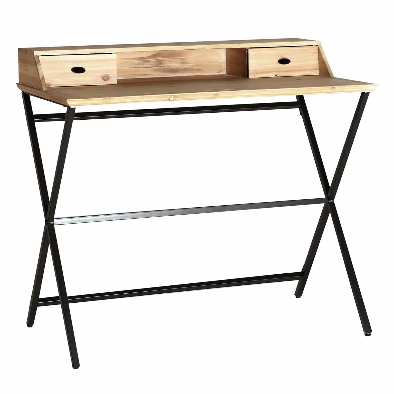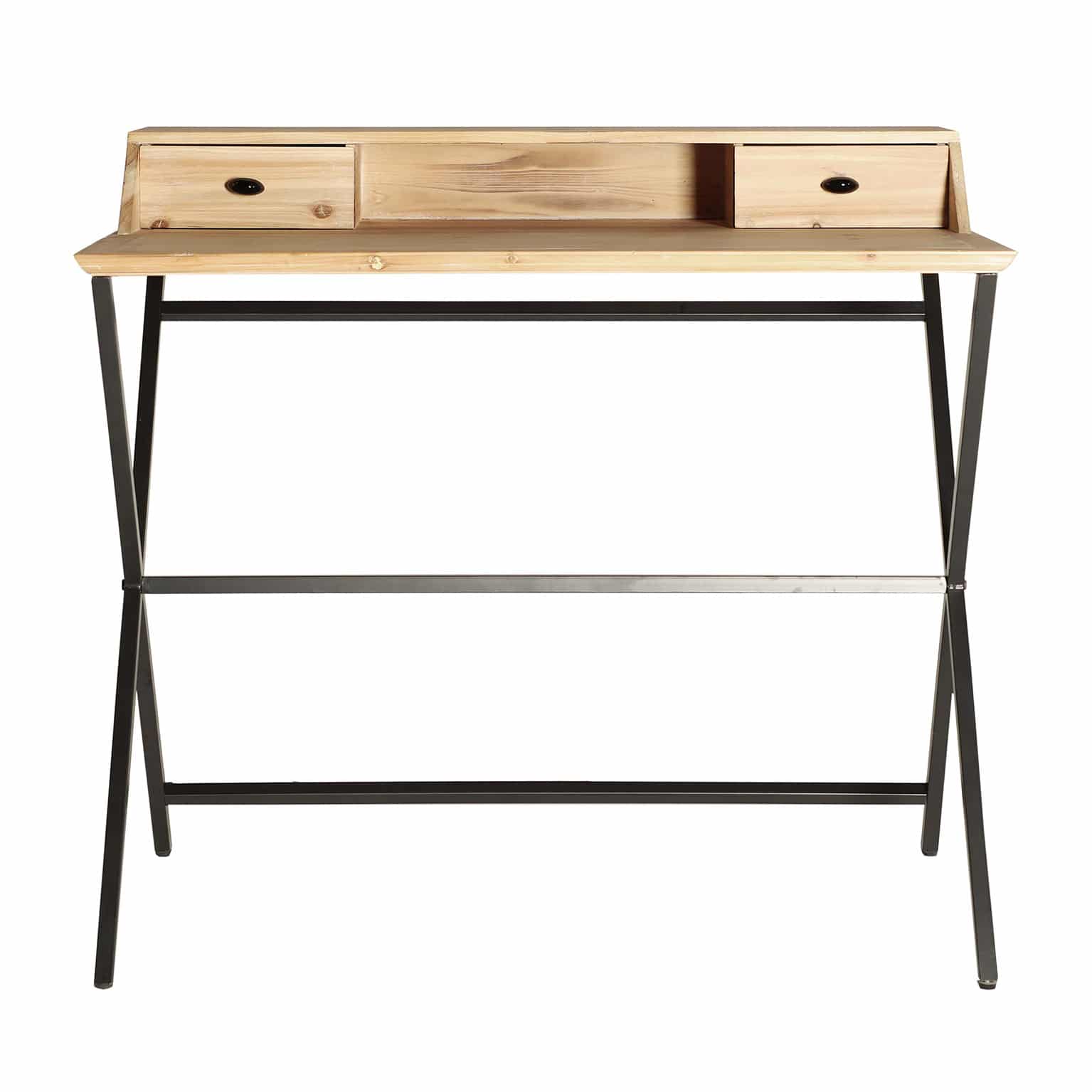 Escritorio en madera de abeto y metal, ideal para crear un acogedor rincón de trabajo con aire vintage. Realizado en madera de abeto natural, con hueco y dos pequeños cajones en la parte superior. Sus patas cruzadas en hierro negro requieren montaje. Medidas 100x60x90cm.Medidas cajones. 20x16x8cm.medidas hueco: 44x18x10.Consultar disponibilidad.