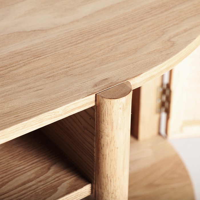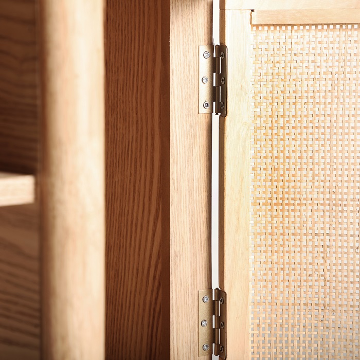 Su estructura de líneas redondeadas está fabricada en madera de fresno natural y dm combinada con rejilla de ratán.