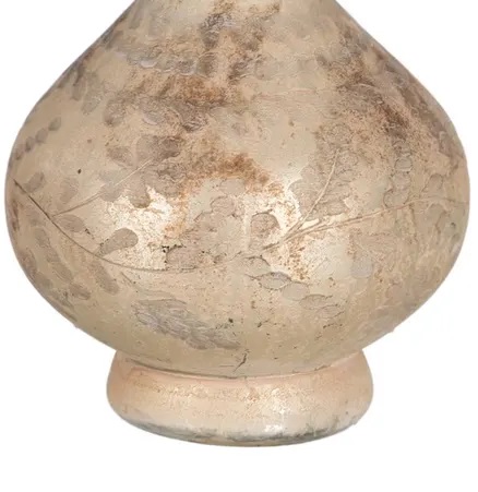 Un delicado jarrón en cristal tintado, acabado en color champagne, con detalles florales grabados. Estilo étnico.