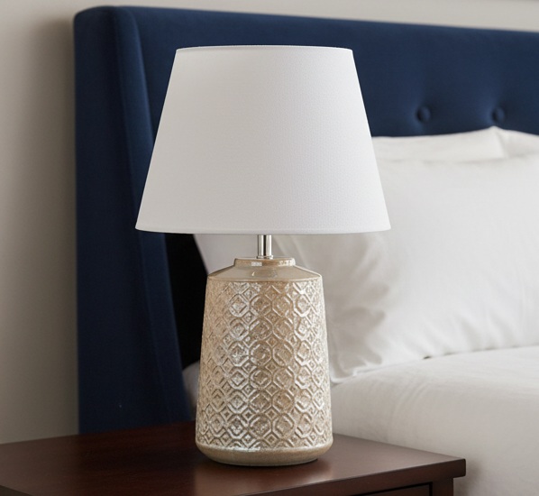 Esta lámpara de mesa de cerámica esmaltada combina diseño decorativo y funcionalidad para iluminar cualquier estancia del hogar con estilo. Su base presenta un elegante grabado con motivos geométricos y un sofisticado acabado en color beige, lo que la convierte en una pieza versátil que se adapta fácilmente a decoraciones modernas, nórdicas o contemporáneas.