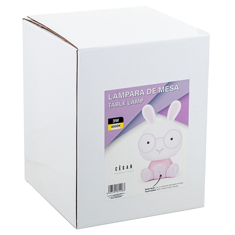 Fabricada en melamina y acrílico, con una original forma de conejo y acabada en color rosa. Alimentación por cable USB..