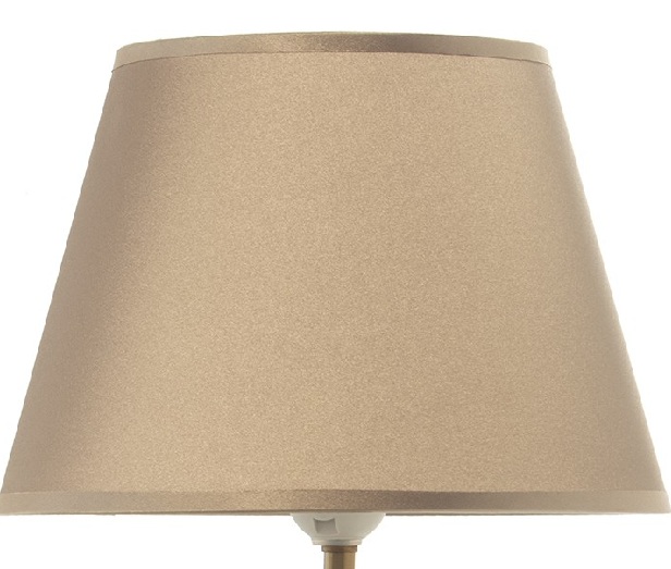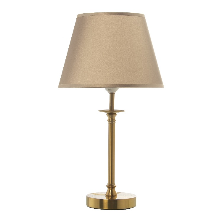 Lámpara de mesa clásica con pie tubular y base redonda en metal dorado y tulipa cónica en color marrón claro. Una lámpara elegante que aporta iluminación cálida y estilo a salones, dormitorios o mesas auxiliares.