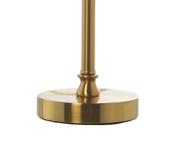 Esta lámpara de mesa clásica combina elegancia y funcionalidad para aportar un toque sofisticado a cualquier estancia del hogar. Su estructura está formada por un estilizado pie tubular y una base redonda en metal dorado que aporta luminosidad y un acabado refinado.
