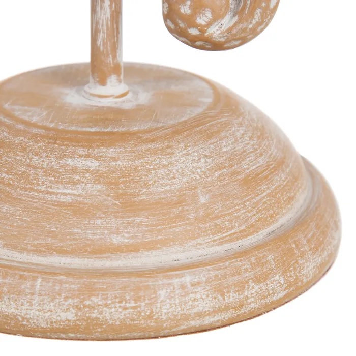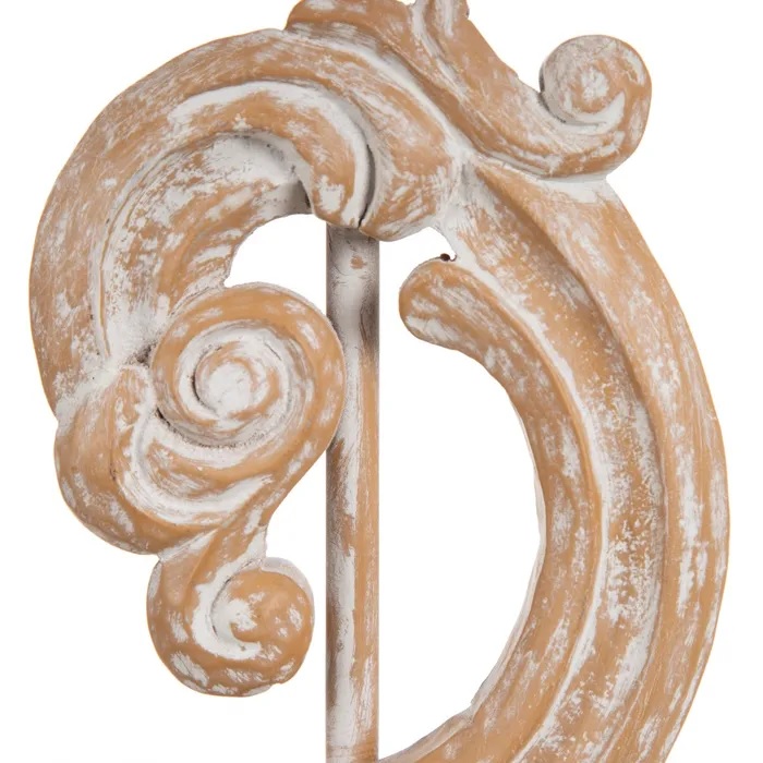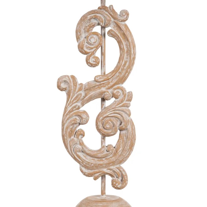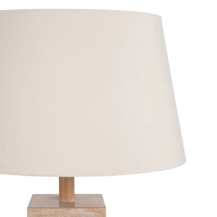 El pie está tallado en resina de color madera natural efecto desgastado con una pátina ligera en blanco. La tulipa circular es de lino en color beige.