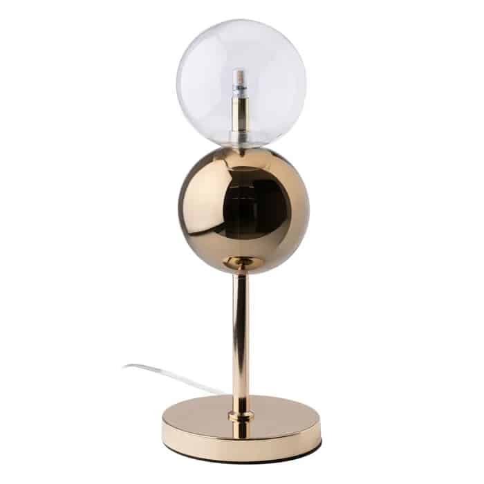 Lámpara de sobremesa de diseño, con tulipas esféricas de cristal combinadas con metal dorado.