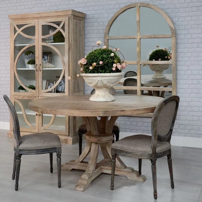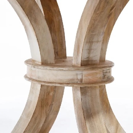 Mesa redonda de comedor en madera de mango natural ,efecto rozada con pátina en blanco.Medidas: 150dx76 cm.Requiere montaje de patas.Estilo clásico.Consultar disponibilidad.
