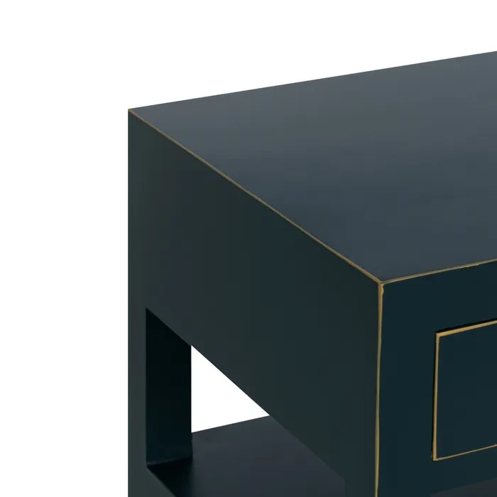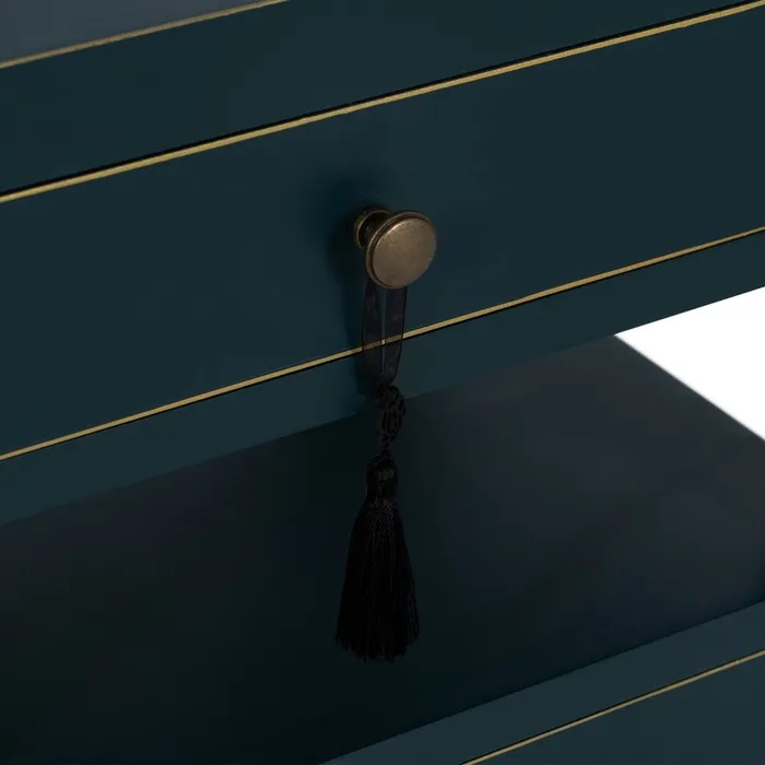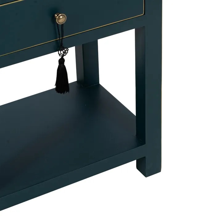 Mesita auxiliar azul oscuro de estilo oriental equipada con dos cajones y un estante. Tiradores en metal dorado.