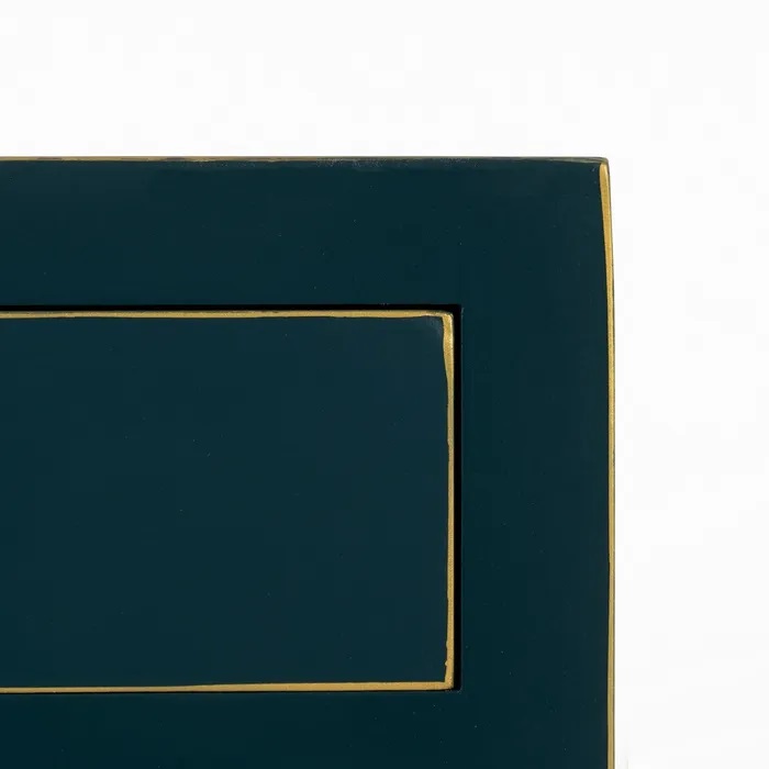 De línea estilizada, está equipada con dos cajones y un estante inferior. Fabricada en dm combinada con madera de abeto. Su lacado en azuloscuro con detalles dorados en los filos aportan un plus de color y elegancia. Los tiradores son en metal dorado.