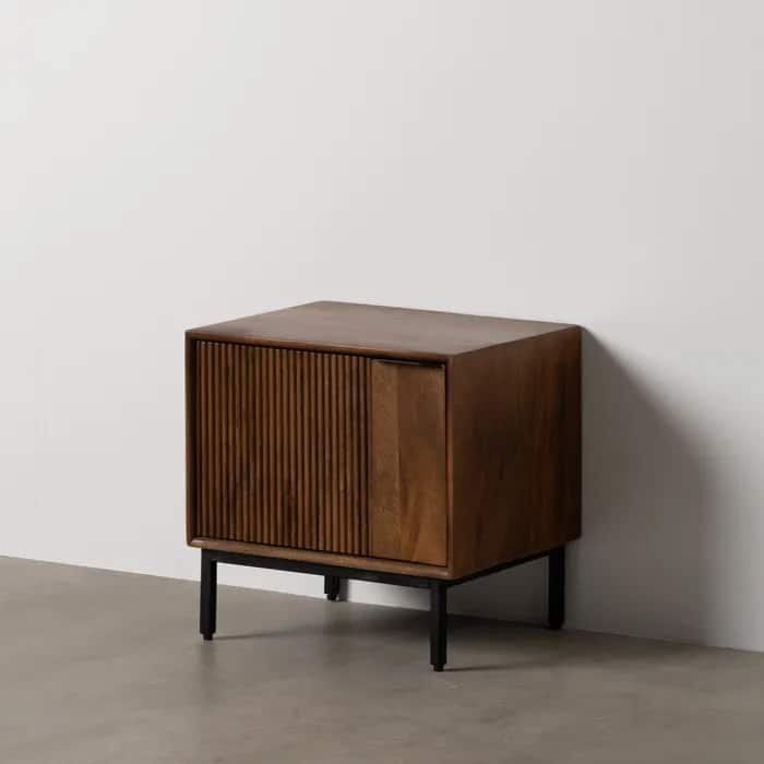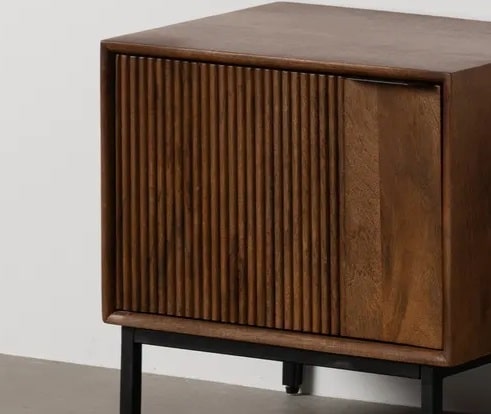 En ella encontrarás esta original mesita de noche ,fabricada en  madera de mango acabada en un bonito marrón veteado. El frontal de la puerta tiene líneas verticale grabadas.
