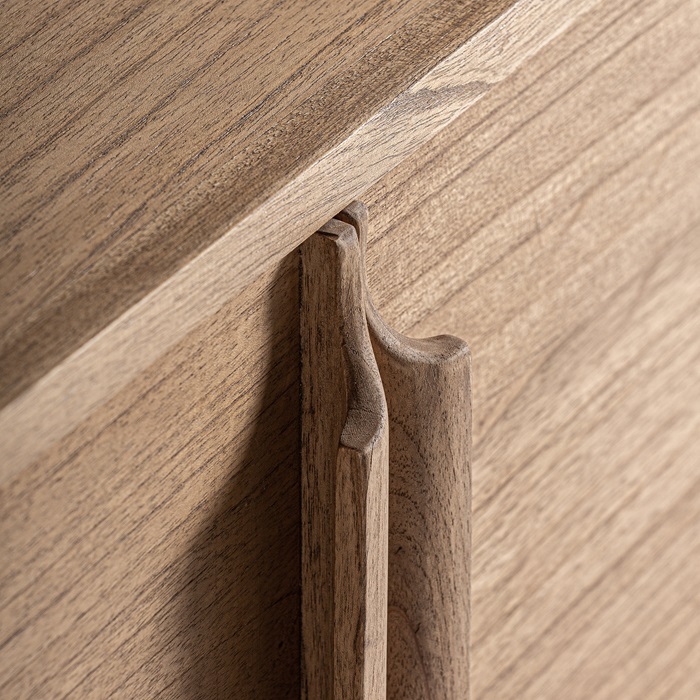 Está fabricado íntegramente, incluidos patas y tiradores, en madera maciza de mindi acabado en natural.
