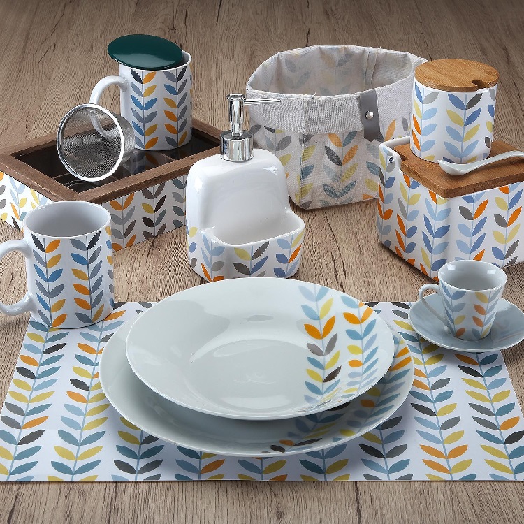Fabricada en porcelana blanca con un dibujos de hojas en color amarillo, gris y azul. Filtro de acero incluido.