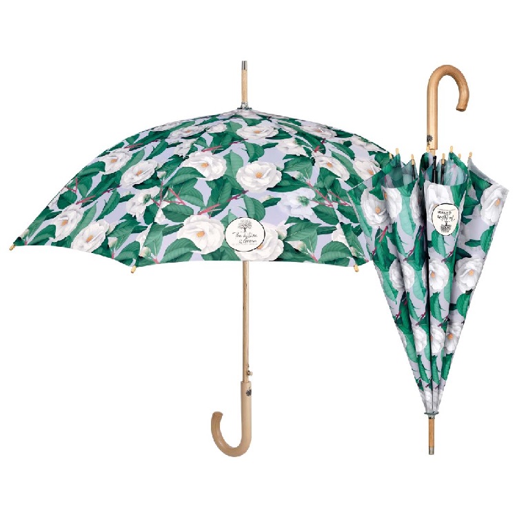 Paraguas de la colección Eloise.  Con tela fabricada en tejido reciclado R-PET y con puño de madera, material biodegradable. Estampado Vegetal.