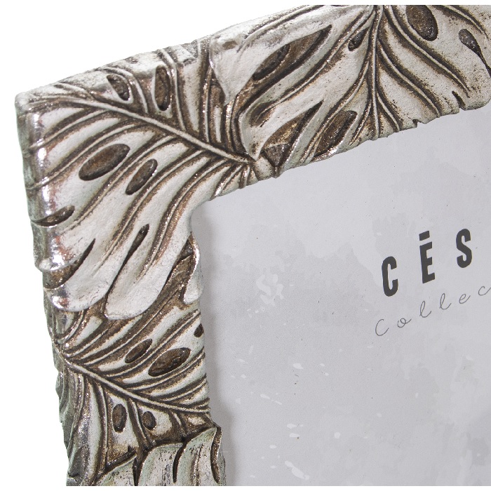 Portafotos en resina con acabado en plata vieja y marco grabado con hojas.