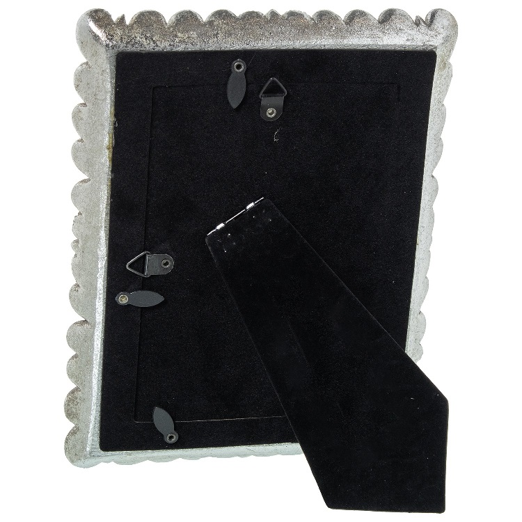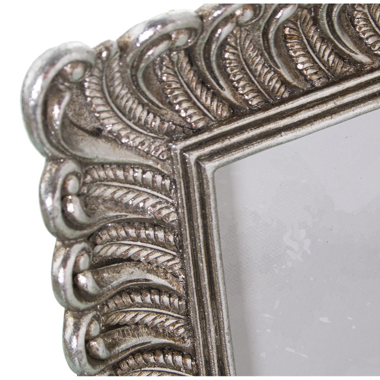Portafotos en resina con acabado en color plata vieja y marco con relieve en forma de plumas.