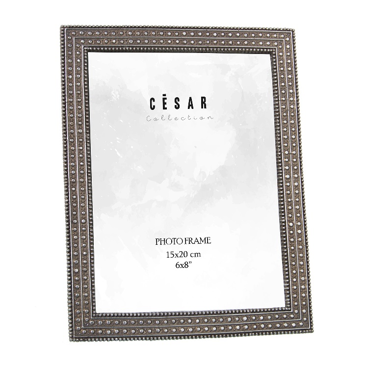 Portafotos en resina con acabado en color plata vieja y marco con tachuelas.