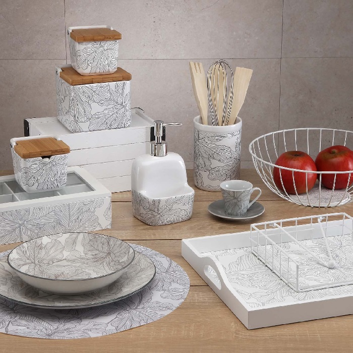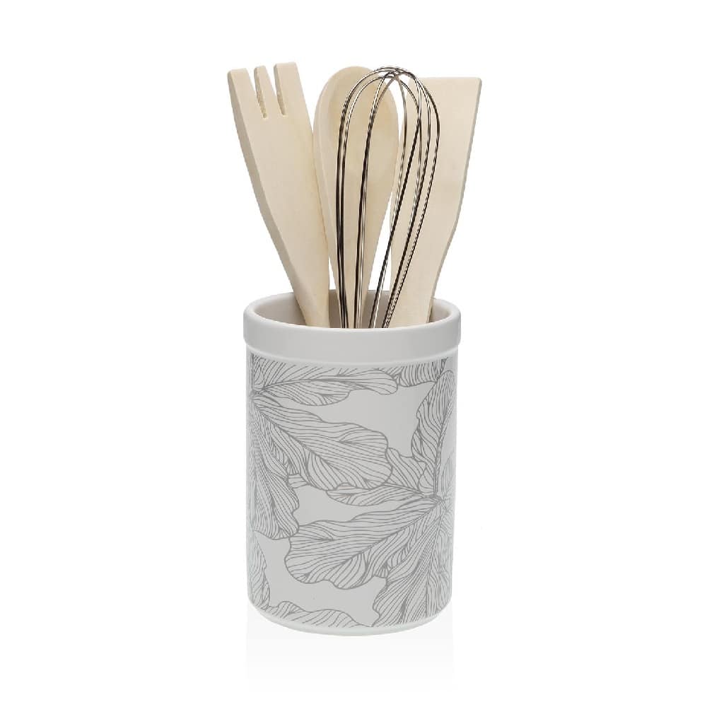 Renueva tu cocina con nuestro portautensilios en cerámica blanca con dibujo de hojas en color gris. Estilo vintage.