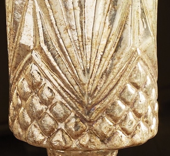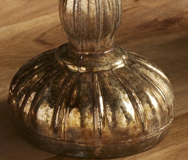 Portavelas en forma de copa, fabricado en cristal envejecido grabado y acabado en un suave color champagne con reflejos dorados.