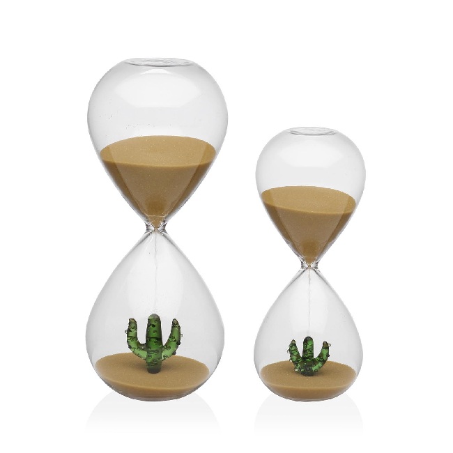 El cactus interno, cuidadosamente elaborado, añade un aire fresco y original que lo distingue de los relojes de arena tradicionales.