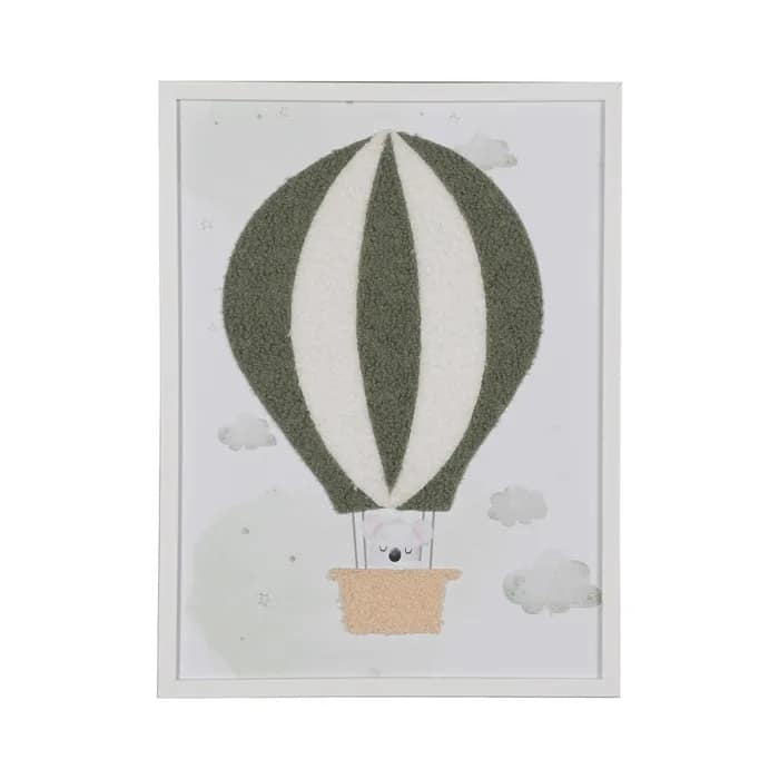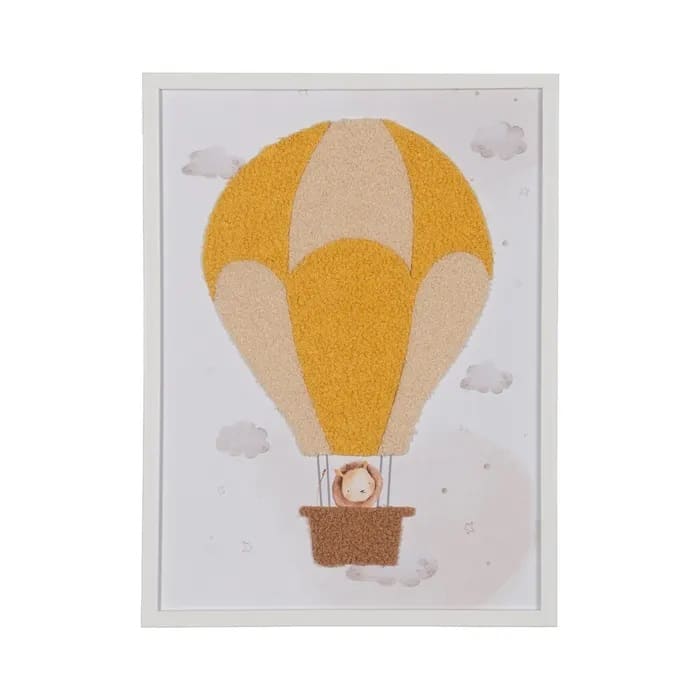 Set de 2 cuadros con dibujo impreso con motivos de globos y simpáticos ositos en tonos blancos, mostazas y grises.Marco en poliestireno blanco.Grosor 2cm.