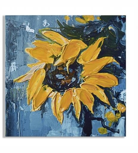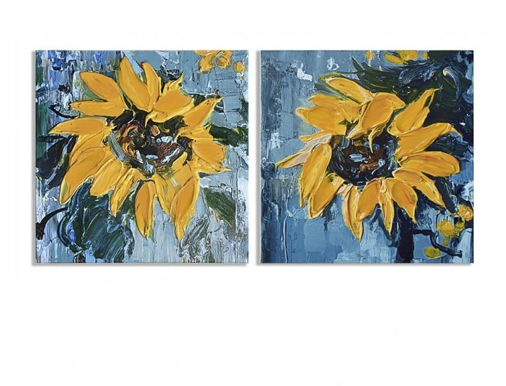 Set 2 óleos con dibujos de girasoles en tonos amarillos sobre fondo azul.Técnica mixta: 50%pintura al óleo-50%impresión.Medidas 2M 30x30cm.Estilo moderno. Incluye anclajes. Consultar disponibilidad y posibilidad de venta individual.