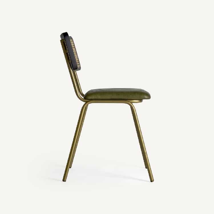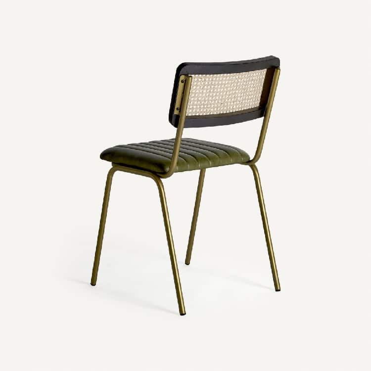 El asiento, están acolchado con un confortable relleno de goma espuma y fibra siliconada de gran calidad y tapizado en cuero verde con líneas pesputeadas. El respaldo de rejilla trenzada natural está enmarcado en madera acabada en negro.