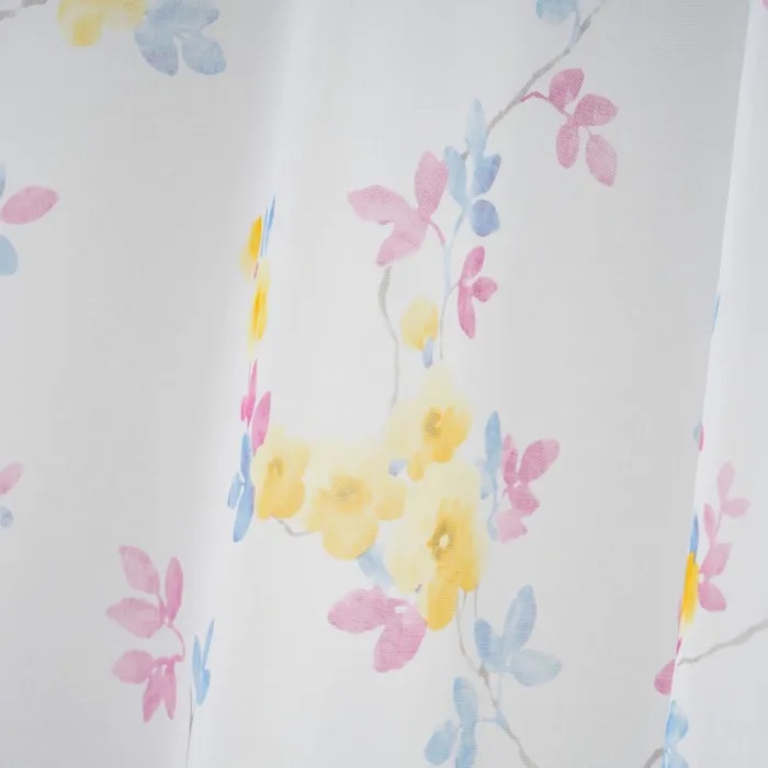 Nuestros visillos Lilith están fabricados en un ligero tejido de poliéster con un alegre estampado de flores amarillas, rosas y azules sobre fondo claro.