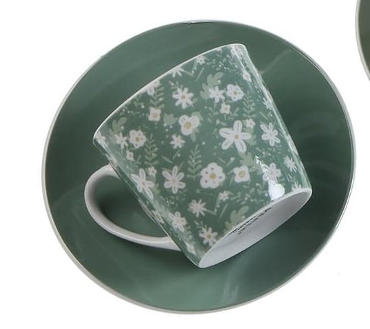 Set de 6 tazas en porcelana blanca con dibujos de florecillas blancas sobre fondo verrde o gris.