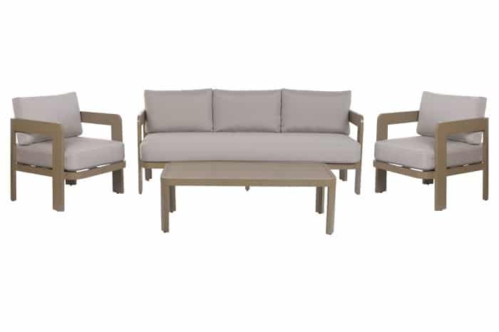 La estructura está fabricada en aluminio con acabado efecto madera, lo que proporciona gran resistencia a la intemperie sin renunciar a la estética cálida y natural de la madera. Los asientos y respaldos incorporan cojines desenfundables en tejido beige impermeable, fáciles de limpiar y mantener. Su relleno de espuma garantiza una sentada cómoda y firme.