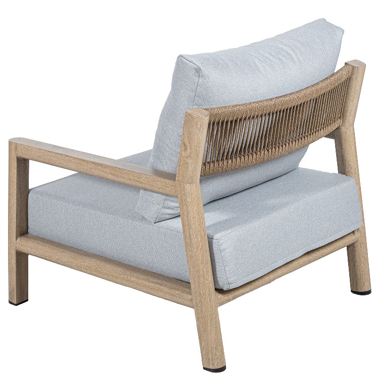 Los asientos y respaldos incluyen cojines en poliéster gris claro con relleno de foam, proporcionando una sentada cómoda, firme y confortable. Su tonalidad neutra facilita la combinación con cualquier estilo decorativo, desde ambientes modernos hasta espacios más naturales o mediterráneos.
