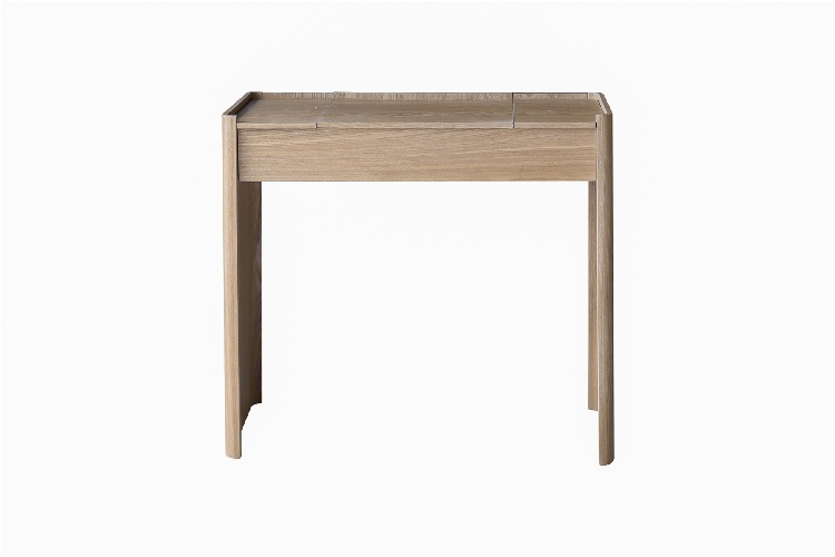 Su tapa basculante oculta un espejo integrado y varios compartimentos interiores, ideales para organizar cosméticos, joyas y accesorios de forma discreta y ordenada. Cuando la tapa está cerrada, el tocador mantiene una estética limpia y sobria, integrándose fácilmente en espacios modernos y nórdicos.