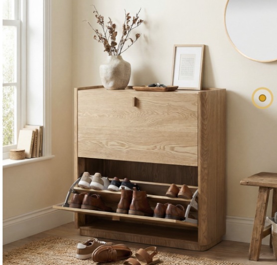 Este zapatero de estilo nórdico es la combinación perfecta entre diseño minimalista y funcionalidad. Fabricado en madera DM de alta calidad combinada con fresno, aporta un acabado natural y cálido que encaja fácilmente en recibidores, pasillos o dormitorios de estilo escandinavo o contemporáneo.